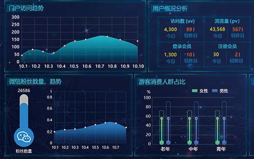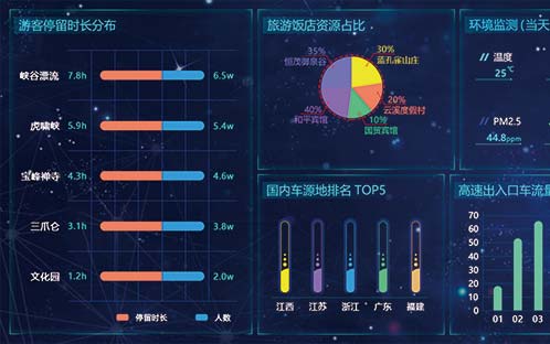 作为指挥旅游的指挥信息中心,主要提供信息网络的核心组件、宏观显示系统、云端接入系统和智慧景区的三维虚拟建模系统,可对区域内的旅游数据进行数据对接,并可对旅游景点的旅游数据进行汇总、监控和分析。
